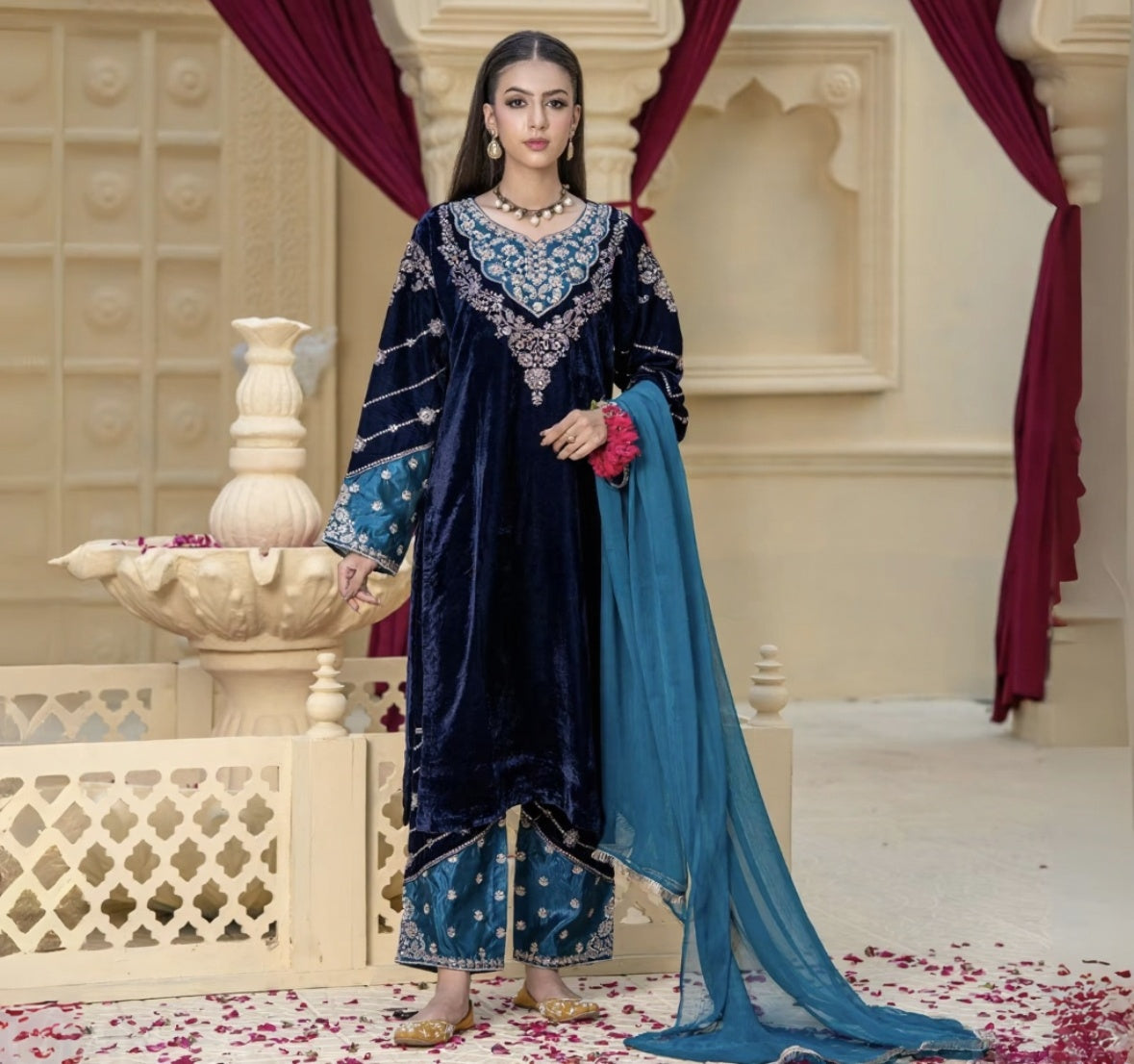 Beautiful Baba Posh festive velvet collection. Available in many different and lovely contrasting colour combinations. The velvet kameez comes in deep tones with intricate thread and zari sequence work on the neckline, sleeves and borders. The beautiful dupatta is chiffon material with a plain lace finishing. It also has a shalwar style trouser with a border that has lovely sequence work to finish off the outfit. Perfect outfits for parties, mehndi, Eid, family gatherings or even wedding functions you want to rock in something comfortable yet gorgeous.
