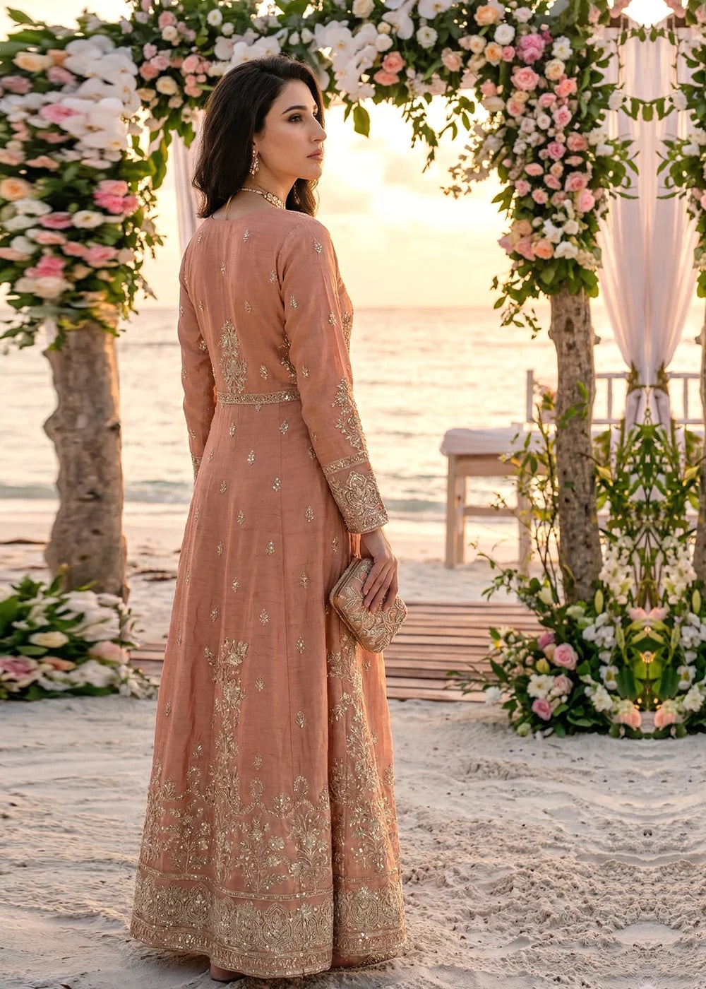 In hues of peach pink, every detail blooms. Embroidered raw silk, a sweeping maxi cut, crepe trousers, and a chiffon veil made for timeless charm. A dreamy ensemble that speaks in quiet luxury