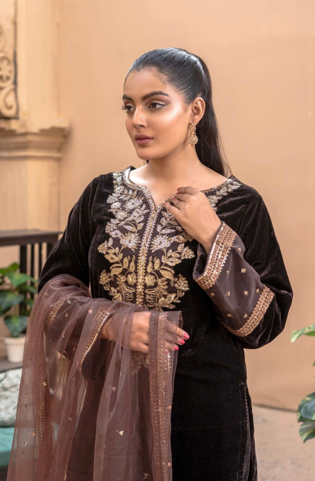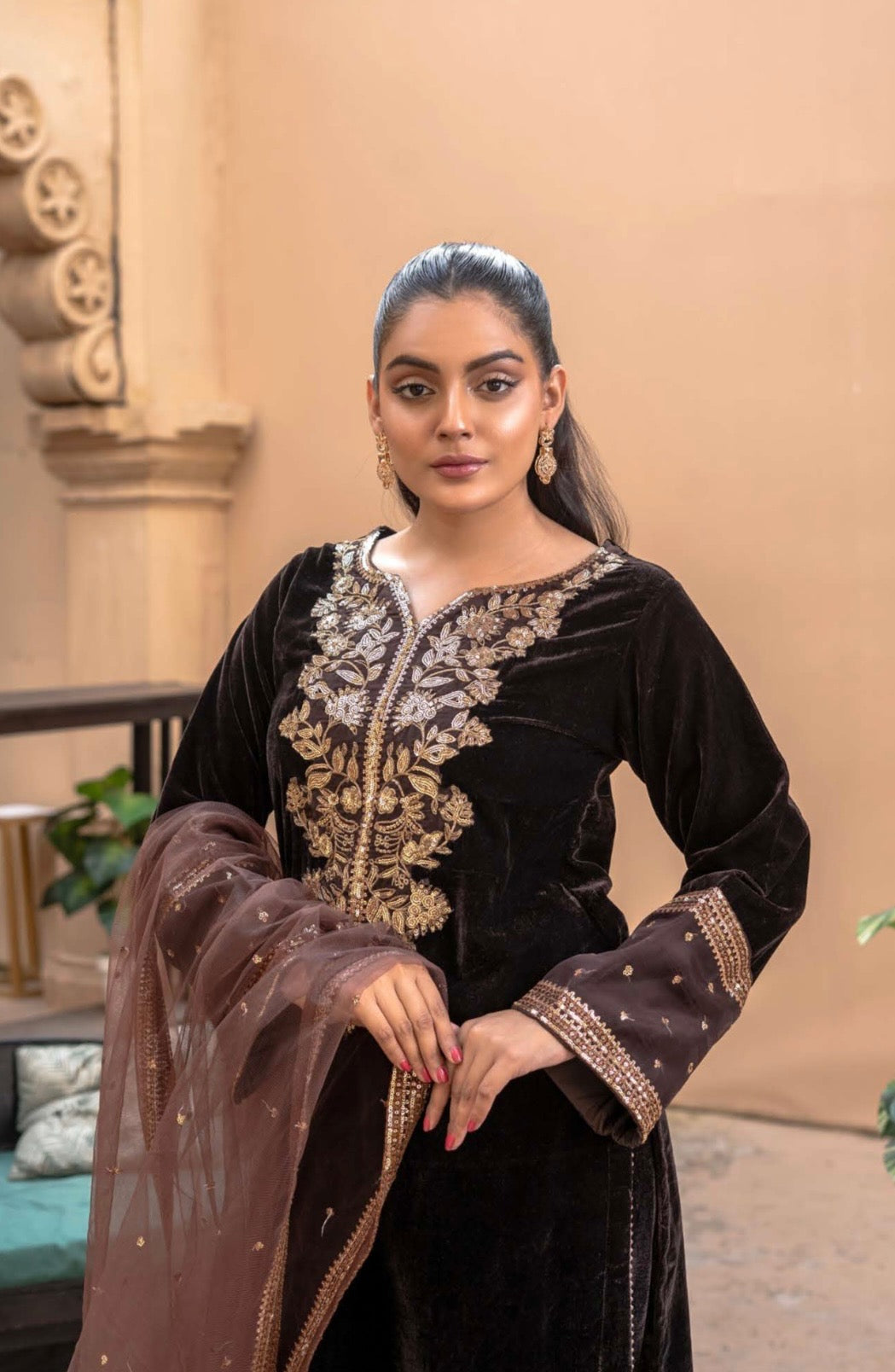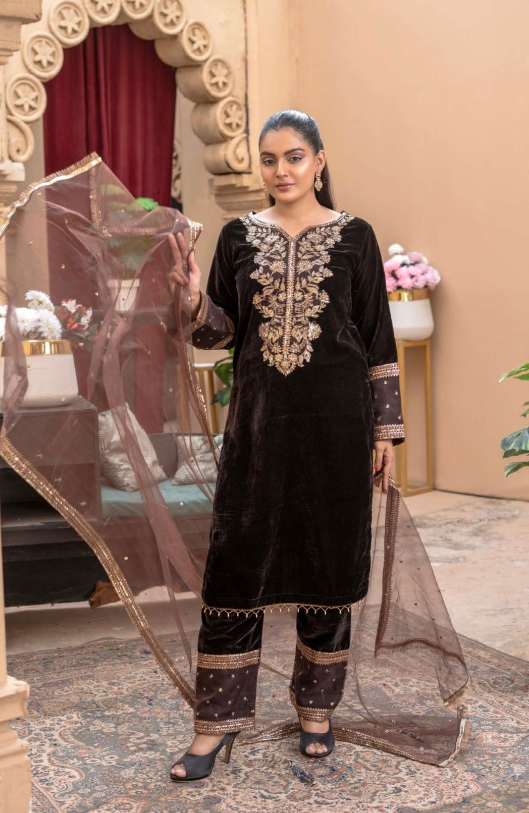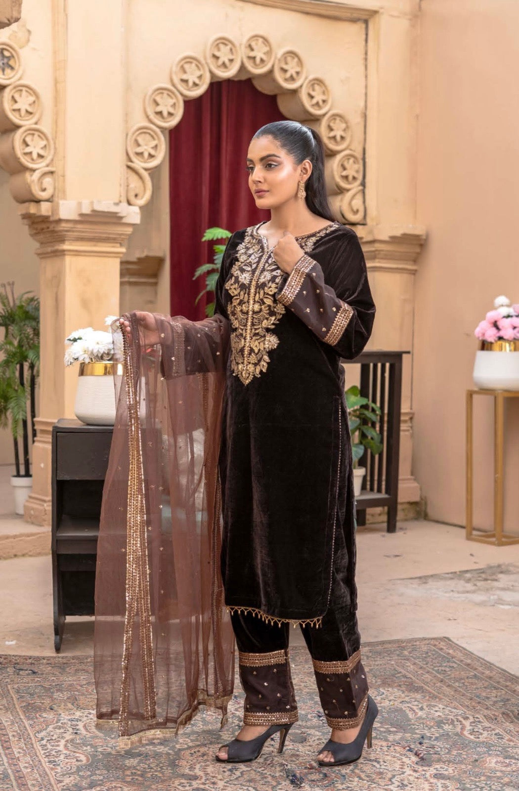 Baroque inspired premium velvet. Brown colour with a gorgeous gold contrast. Decked with beautiful golden embroidery and sequin work and finished with luxury laces and tassels. Also has a border on the trouser and a lovely four sides border on the dupatta.